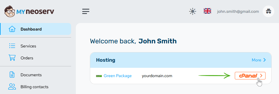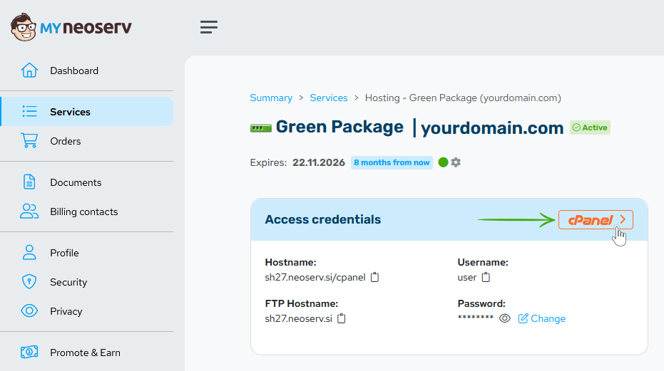 If your hosting package doesn’t have an active domain assigned, you must use the server hostname to log in to cPanel. In this case access cPanel through the My NEOSERV client portal by following the steps in section 2 of this guide.