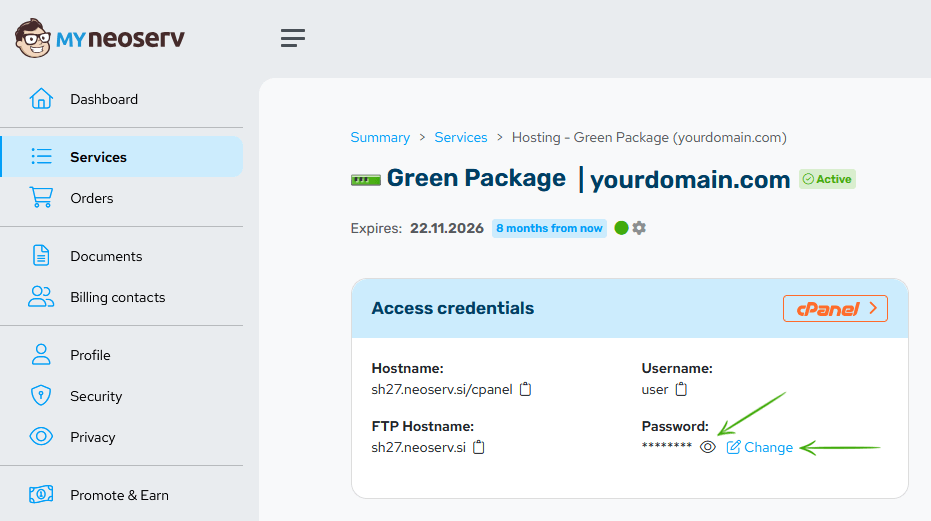 You can find your cPanel login credentials in the email you received after purchasing a hosting package on our website. If you cannot find them, you can change your cPanel access password in My NEOSERV (instructions for changing the cPanel password).