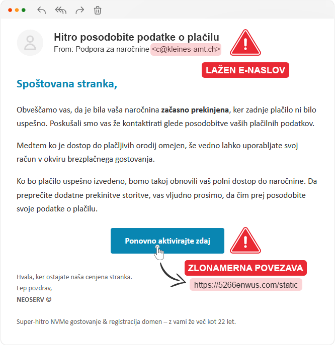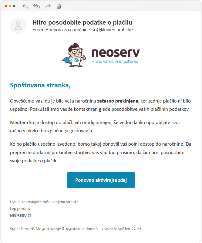 A phishing attack usually starts with an email that at first glance looks like it was sent by a service provider. The attacker wants to create a sense of urgency by threatening to restrict access to services or banking funds if no immediate action is taken. This is to convince the recipient to:
