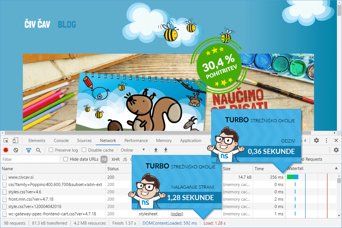 The owners of the Civcav.si online store, despite the relatively fast opening of the online store on the Green package (1.84 s), decided to switch to the TURBO environment. The acceleration was noticeable immediately after the transfer, as the online store opened in 1.28 s. Then, at NEOSERV, we also performed speed optimization and further improved the loading speed. Now, the Čiv Čav online store opens in 463 ms, which compared to the original state means a 74.84% acceleration.