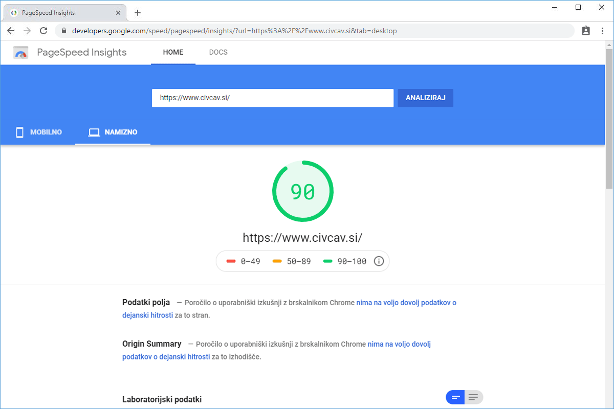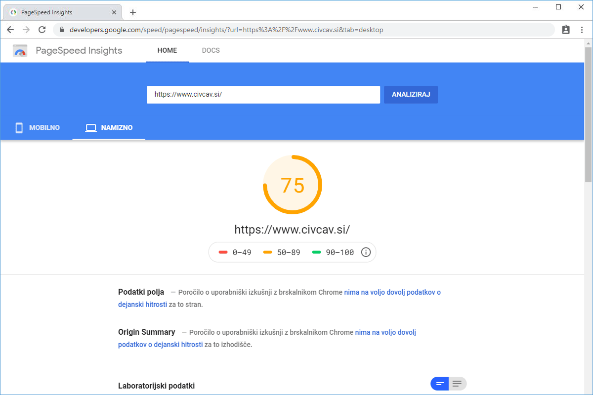 The Civcav.si online store, which operates on the WooCommerce system, has been hosted with us for several years. Before the transfer to the TURBO server, it was hosted on the Green hosting package, where the loading time was already relatively low. The speed test showed that the store's homepage loaded in 1.84 s, with the time to the first byte being just over half a second. The PageSpeed Insights tool's score was 62. It should be noted that the online store was not speed optimized at this stage.