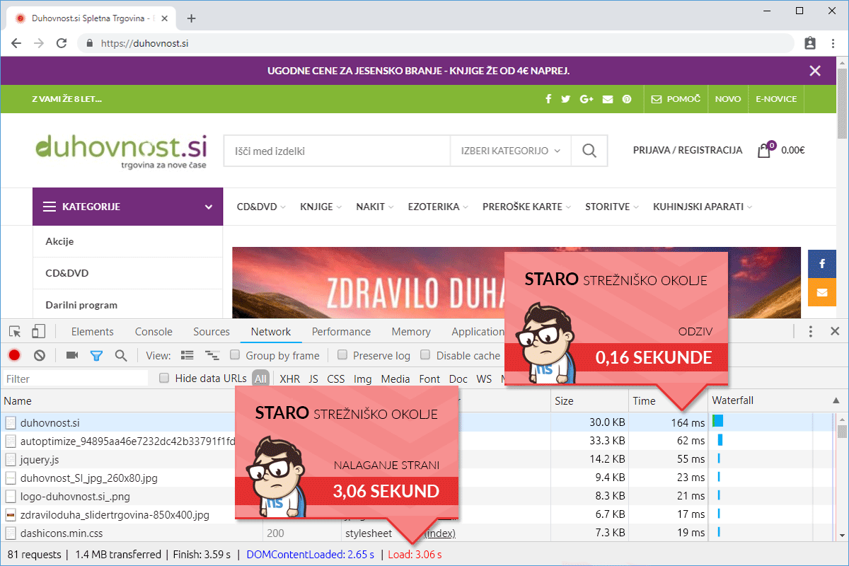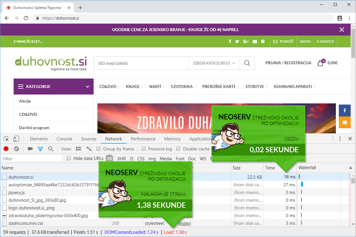 The owner of the Duhovnost.si web store was looking for ways to improve the loading speed of the store to enhance user experience and business results. He decided to transfer the website to our server, so at NEOSERV we decided to conduct a case study.