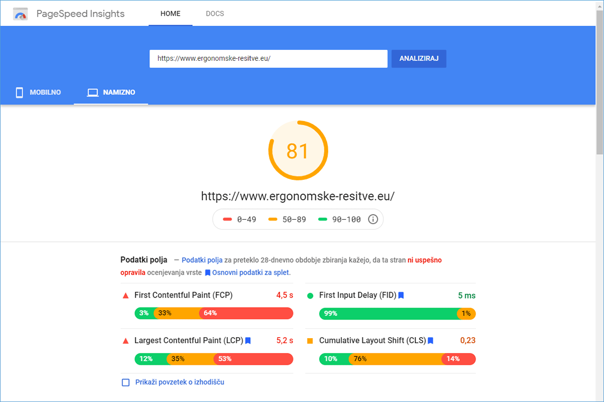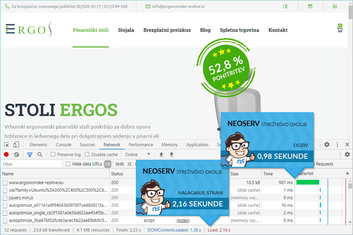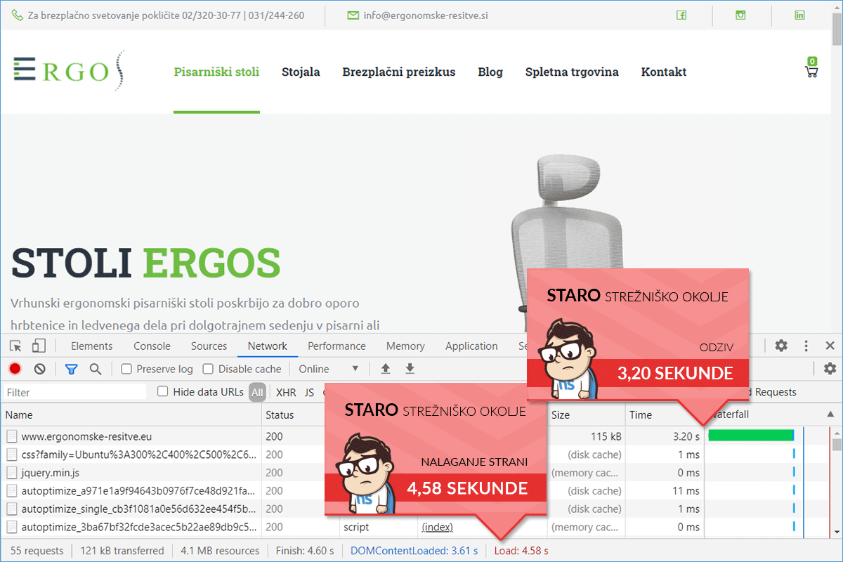 The Ergonomske-resitve.eu online store was hosted on a server of one of the larger hosting providers in the local market before the transfer to us. According to tests performed with the DevTools tool in the Chrome browser, the homepage of the website was opening in about 4 and a half seconds. The company Ergonomske rešitve d.o.o. was aware that the loading time was far from optimal, so they were looking for a solution that would allow them to improve. They noticed our offer of TURBO packages and decided to see the quality of the servers for themselves.