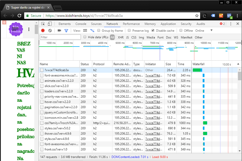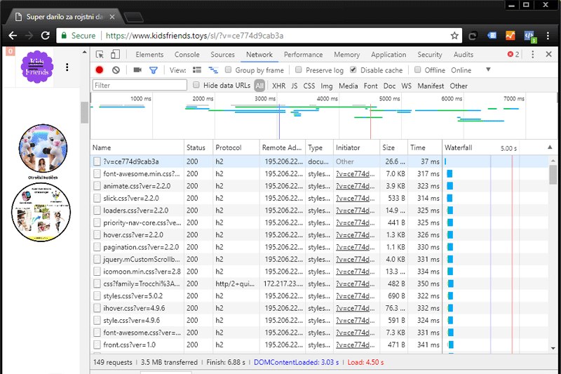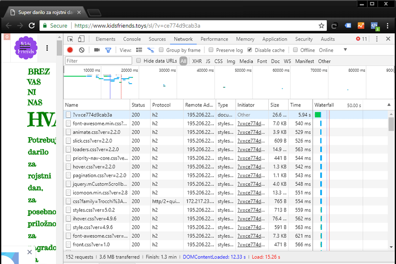 Before transferring the Kidsfriends.toys online store to our server, it operated quite slowly. According to the Chrome DevTools web developer tool, the Time to First Byte (TTFB) on the server at the old provider was 5.94 seconds, while the entire homepage of the online store loaded in 15.26 seconds.