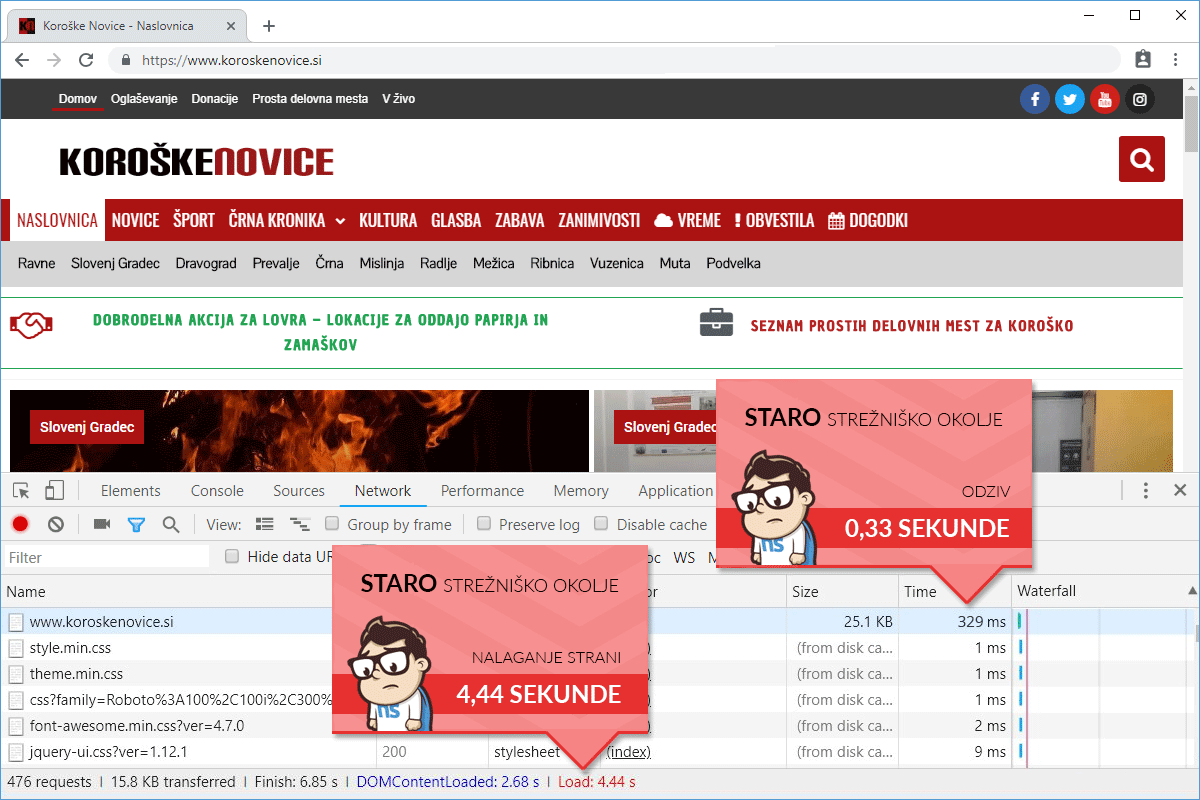 Since the media Koroške Novice is a massively visited web portal, we had to ensure a flawless transfer to our server. Although we always do this – without exception, in this case, we additionally verified the correct functioning before changing the DNS servers. The transfer itself went without any complications, and the speed of the web portal's operation was visible immediately. After the migration was completed, the loading time of the homepage was only 2.31 s.