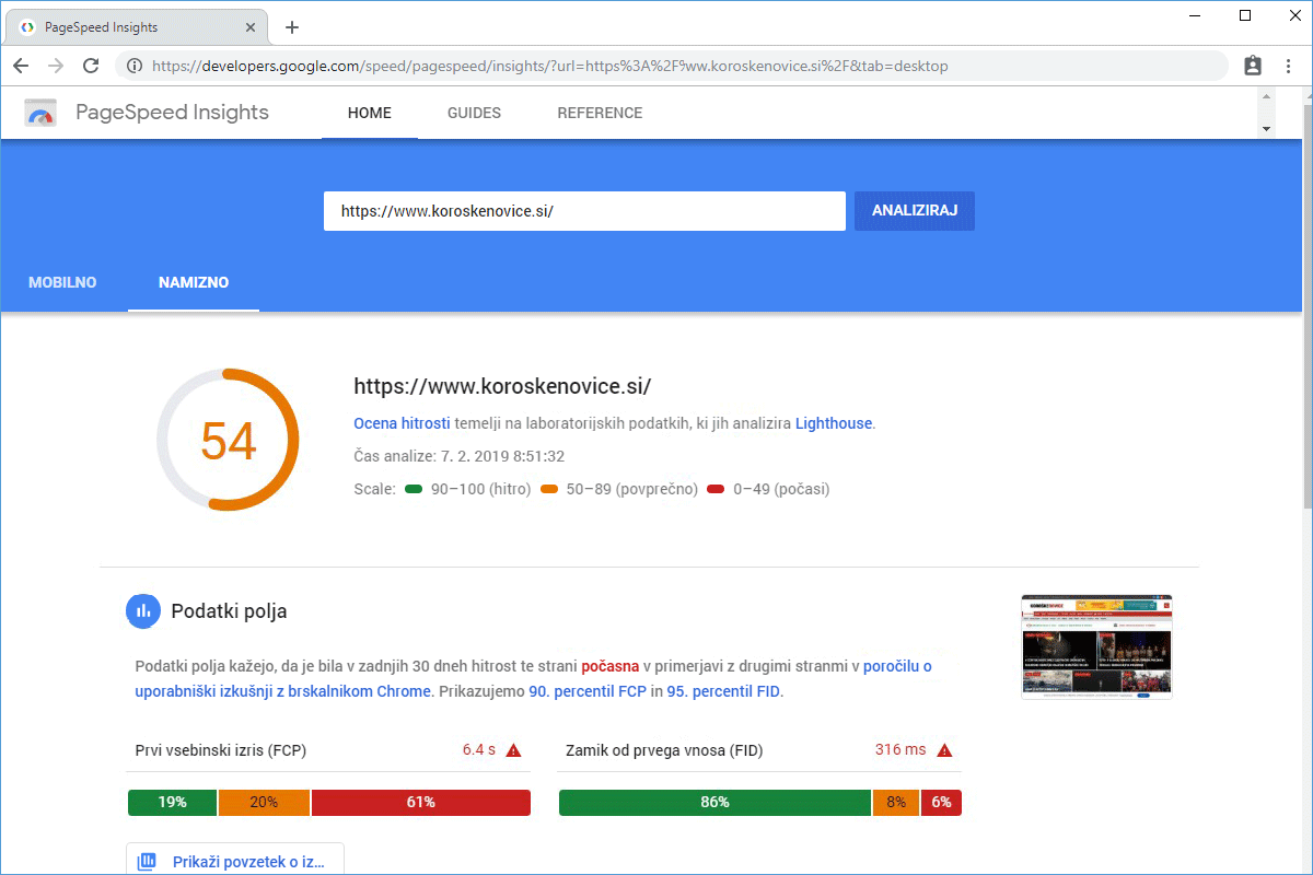 The loading speed of the web media Koroskenovice.si has improved by 61.04%.