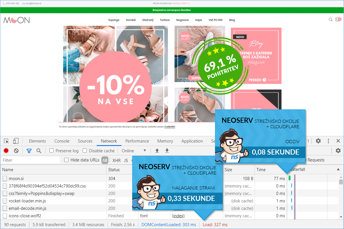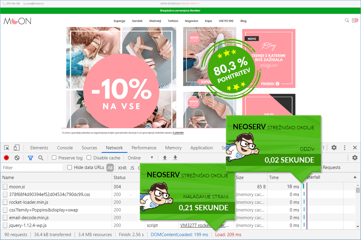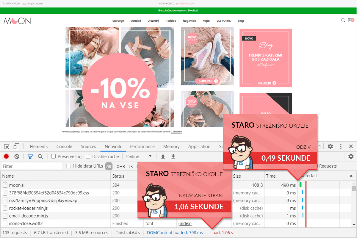 Before transferring to our server, the Moon.si online store was hosted on a server of one of the larger Slovenian hosting providers. The loading time of the online store on the previous server was just over 1 second, which is certainly not a bad result. However, the owner of the online store is clearly well aware of the importance of a responsive online store that attracts more visitors and usually also increases the number of online orders due to a better user experience.