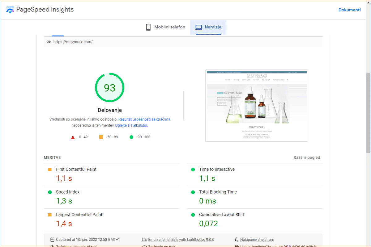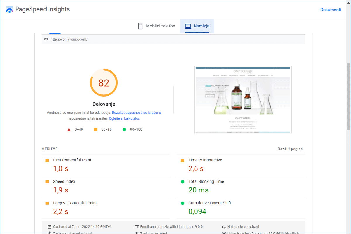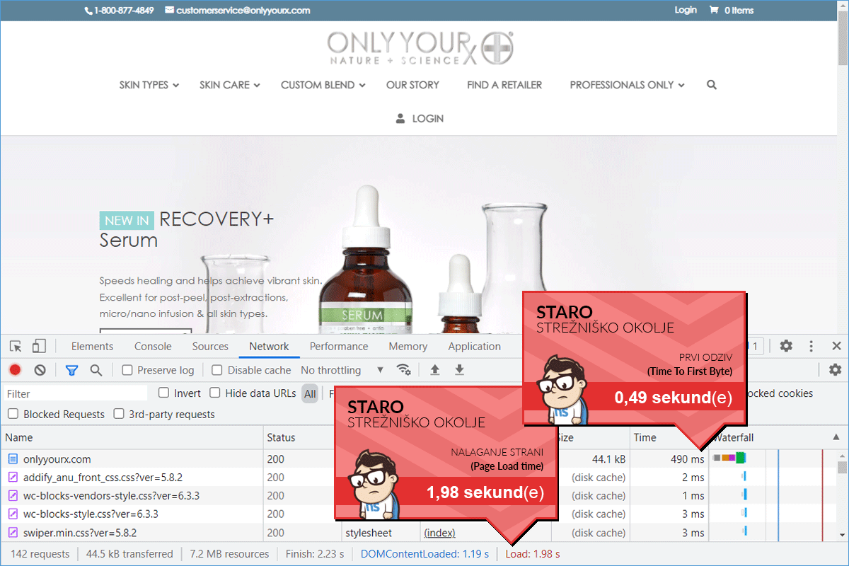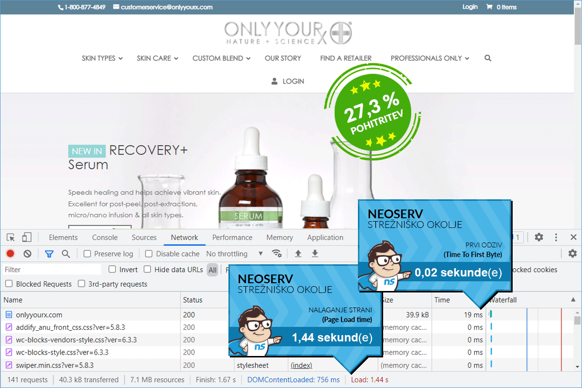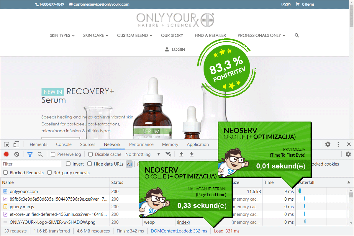 Although the ONLY YOURx online store already loaded relatively quickly on the GoDaddy server, it turned out that the decision to switch to the NEOSERV server was completely justified. The speed optimization that followed the transfer of the online store to us ensured that the store now loads 83.28% faster. And not just for visitors from Slovenia. With the CDN service, we ensured fast loading for all visitors, as the store is "served" from the server that is geographically closest to the individual visitor.