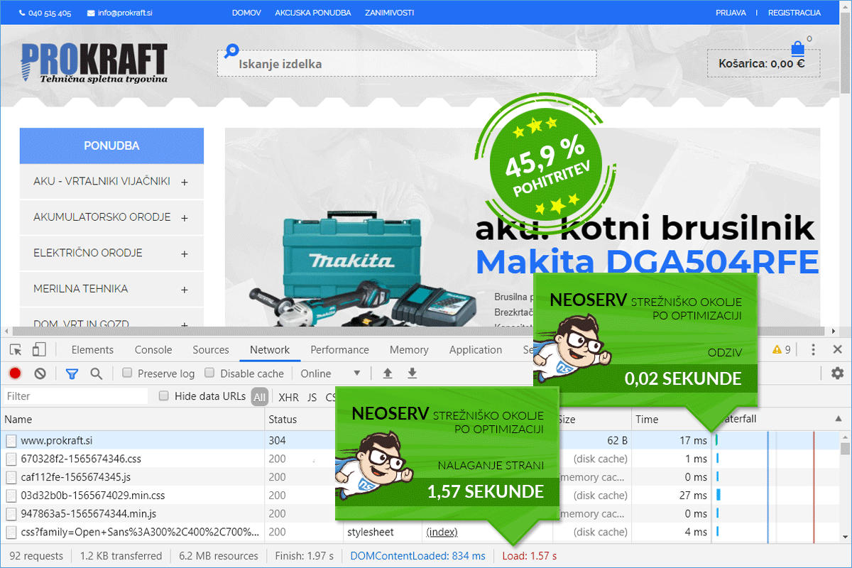 At NEOSERV, we immediately rolled up our sleeves and transferred the web store Prokraft.si to one of our lightning-fast servers. The improvement was evident right after the transfer, and after the basic speed optimization, the web store operated even faster. With the transfer and optimization, we accelerated the loading of the web store by a significant 45.86%.
