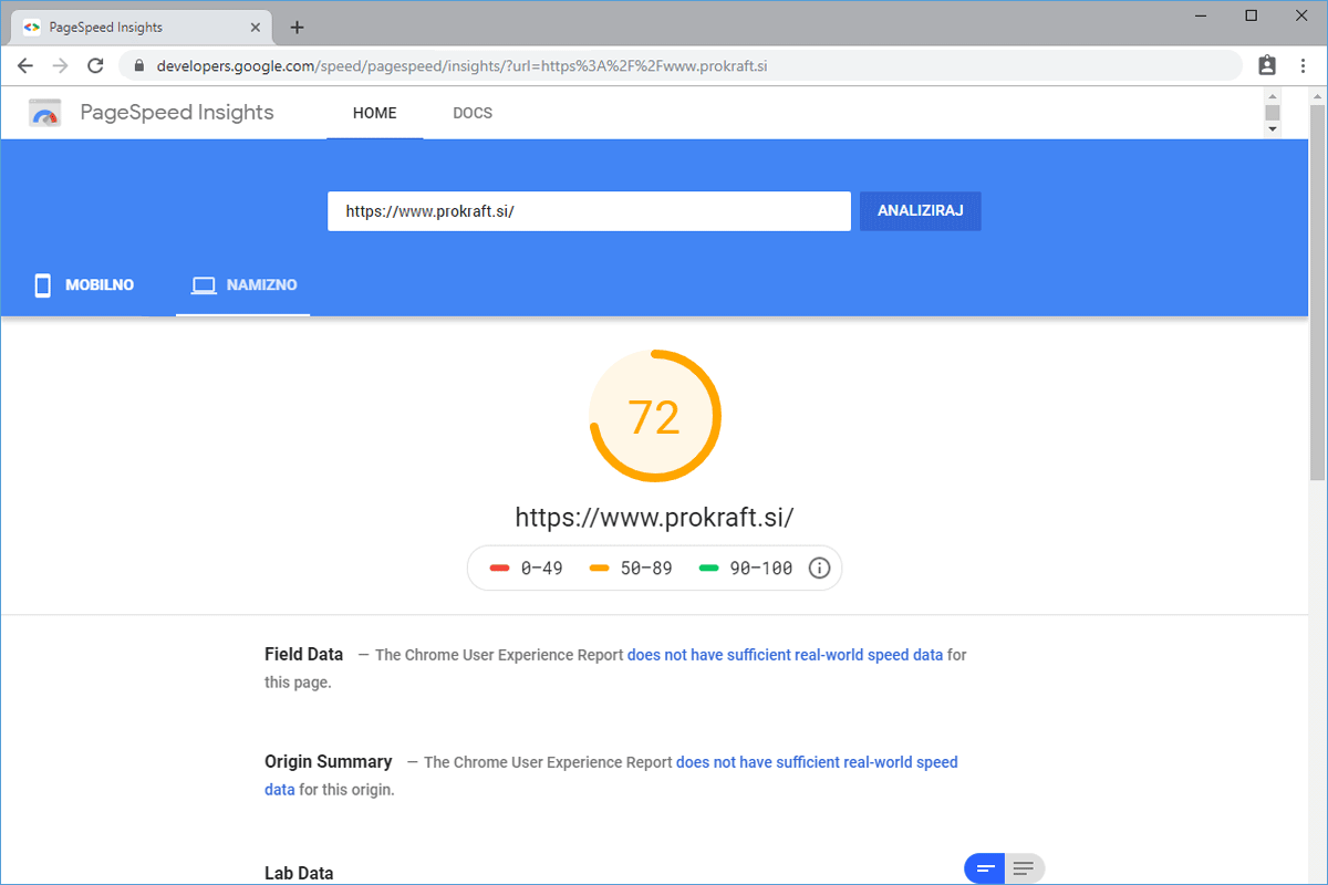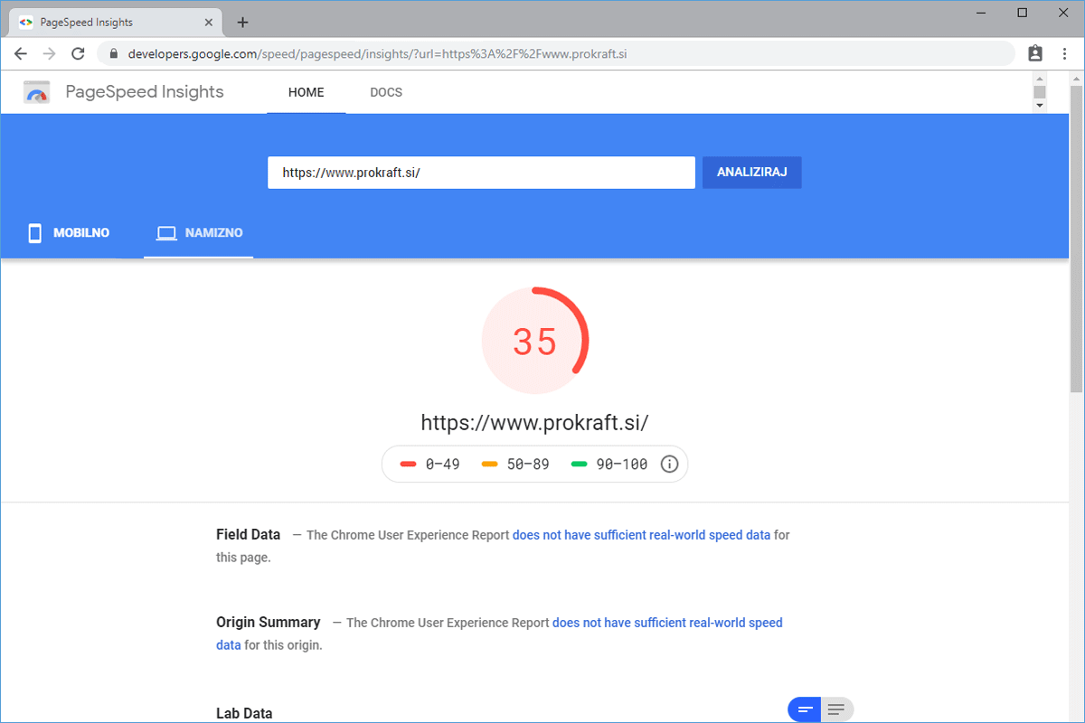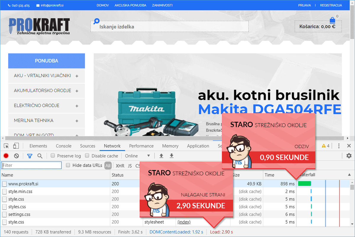 The web store Prokraft.si, before the transfer, was hosted by one of the larger web hosting providers in our country. The homepage loaded in just under 3 seconds, which was also reflected in Google's speed rating. Although the result is not the worst (we have seen much longer page loading times), it is known that every improvement in speed can greatly affect the increase in online sales.