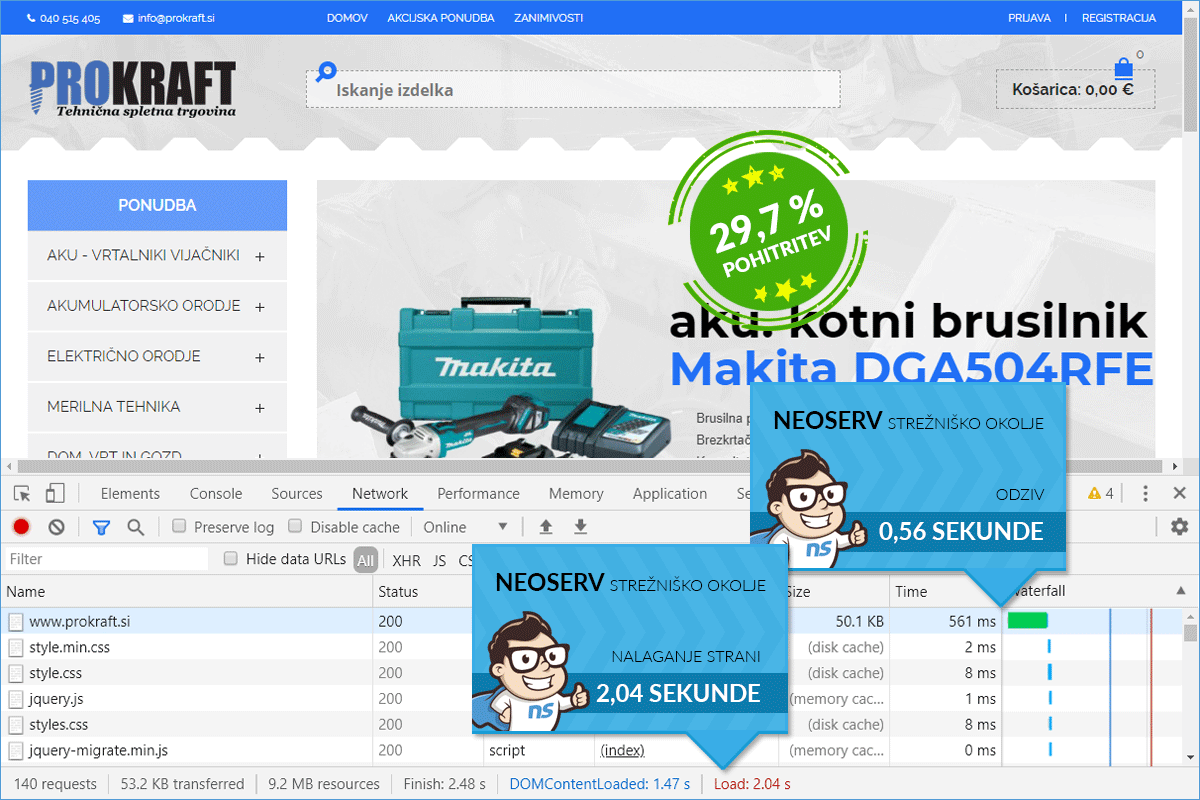 Since Prokraft.si was well aware that loading speed significantly affects online sales, they decided to transfer the web store to the NEOSERV server. The decision turned out to be correct, as the improvement in speed was immediately visible. The total loading time of the web store Prokraft.si on our server was only 2.04 seconds, which meant a 29.66-percent improvement.