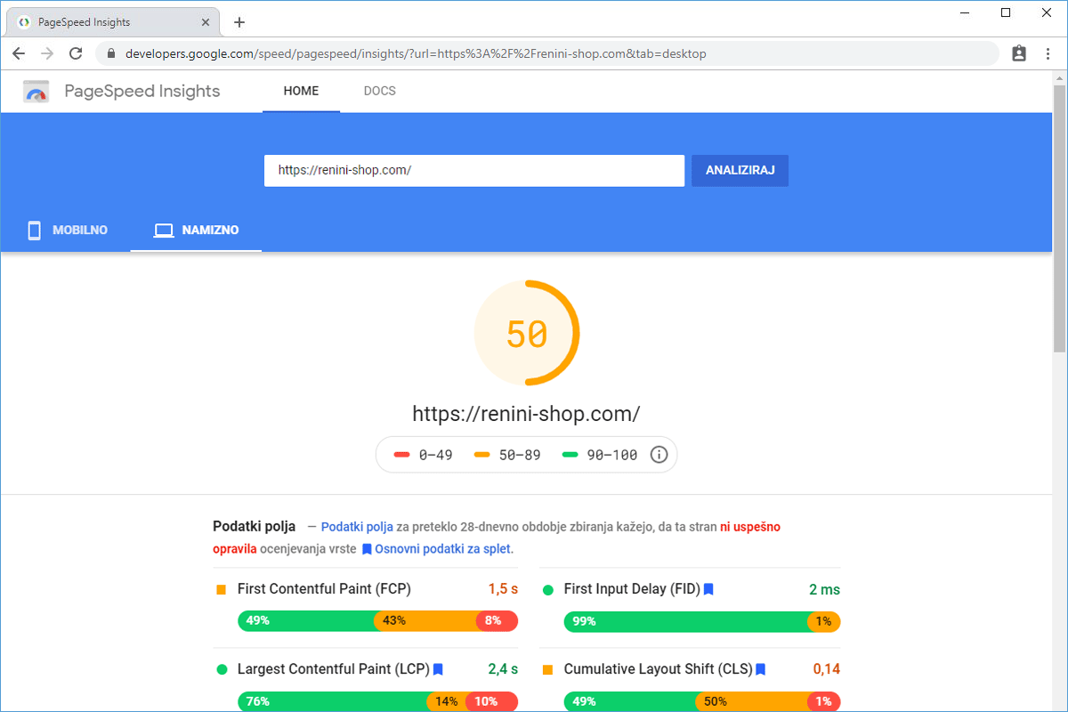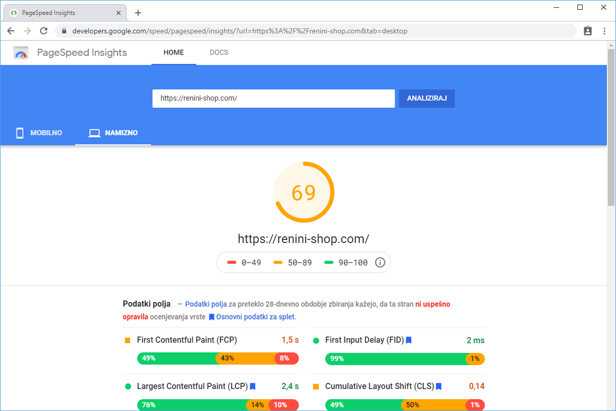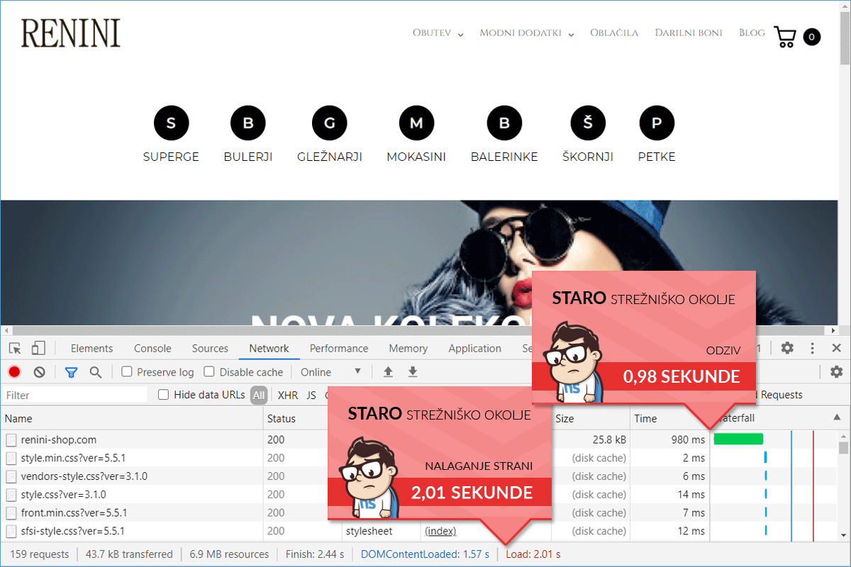 Before the transfer, the online store Renini-Shop.com was hosted on a server of one of the larger web hosting providers in the Slovenian market. The store was not speed-optimized, and a speed test with the Chrome DevTools tool showed that the homepage loaded in approximately 2 seconds for visitors. Although the loading time was not bad compared to similar online stores, the owners decided to try our TURBO server and see how much faster the online store could operate.