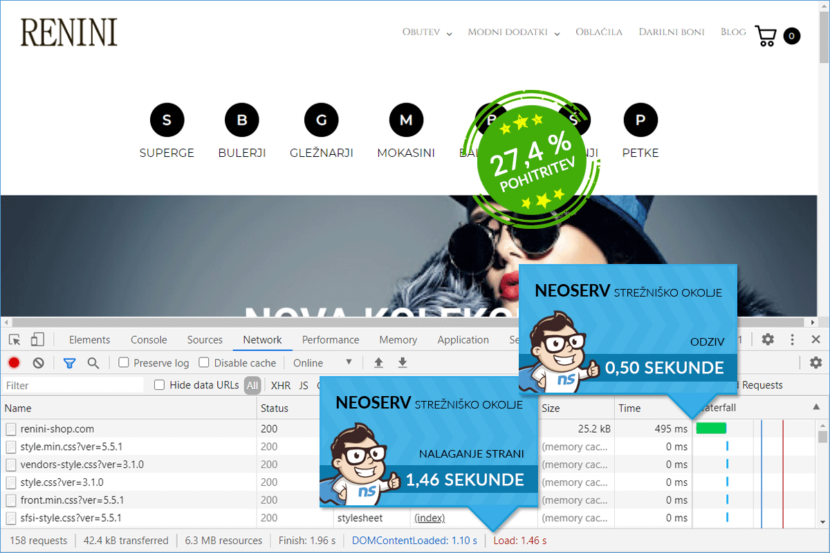 At NEOSERV, we quickly got to work. We transferred the Renini Shop online store to a TURBO server and ensured that there was no downtime during the transfer. The difference in loading speed was noticeable immediately after the transfer, and with speed optimization, we achieved that the online store now loads in less than a second for visitors. Compared to the original state, we achieved a 59.40-percent acceleration in loading.