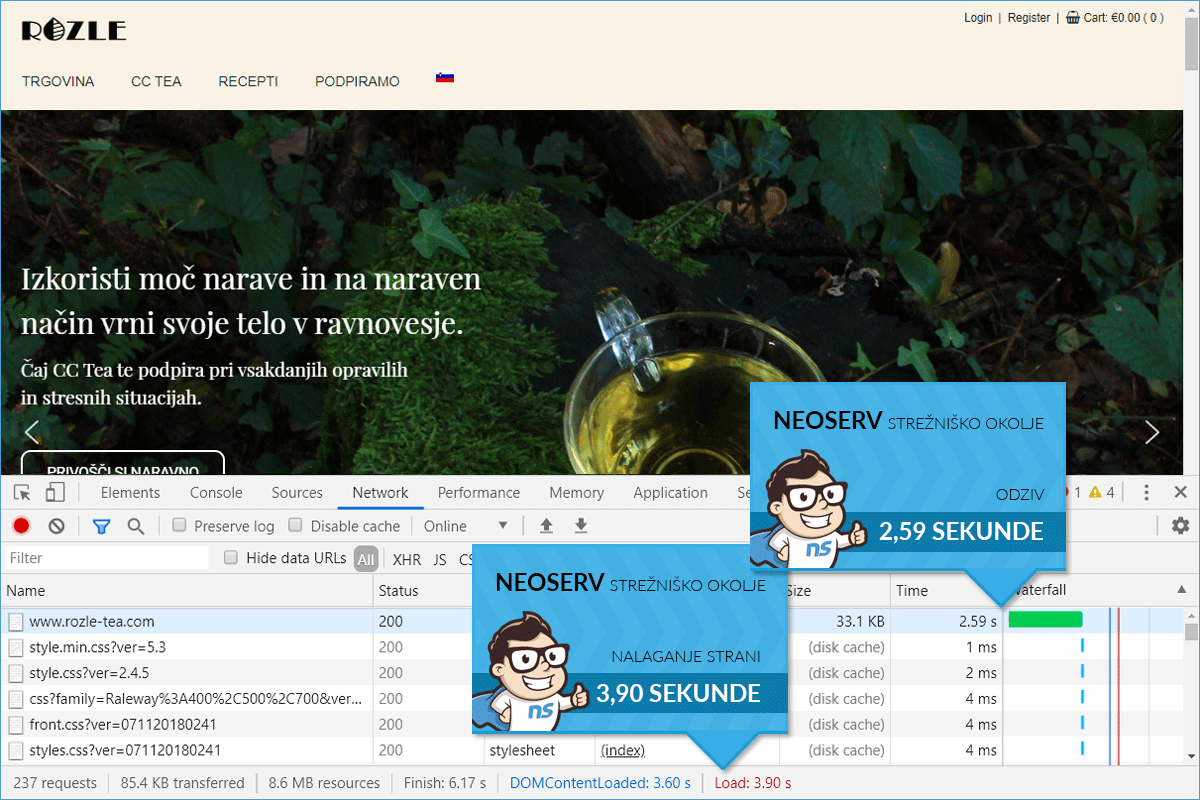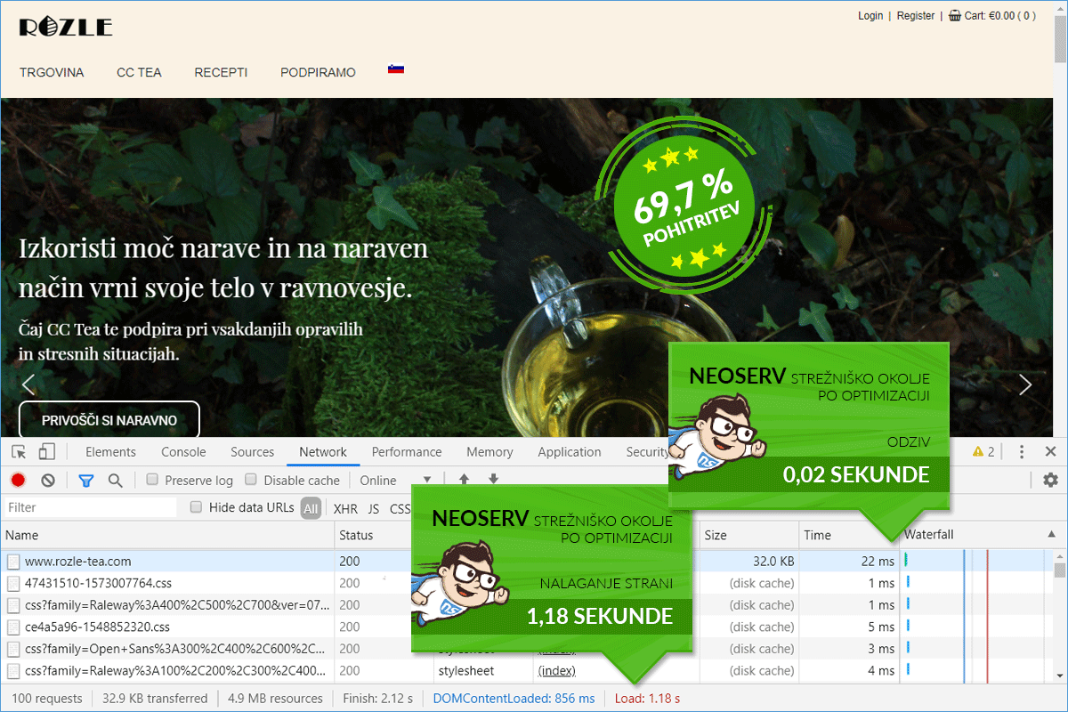 Today's case study is divided into two parts: before speed optimization and after optimization. The Rozle-tea.com online store has been hosted on our servers for several years, which means that this study did not involve transferring the site from another provider to us, but rather an upgrade of the hosting package and speed optimization. With these measures, we accelerated the online store by 69.74%.