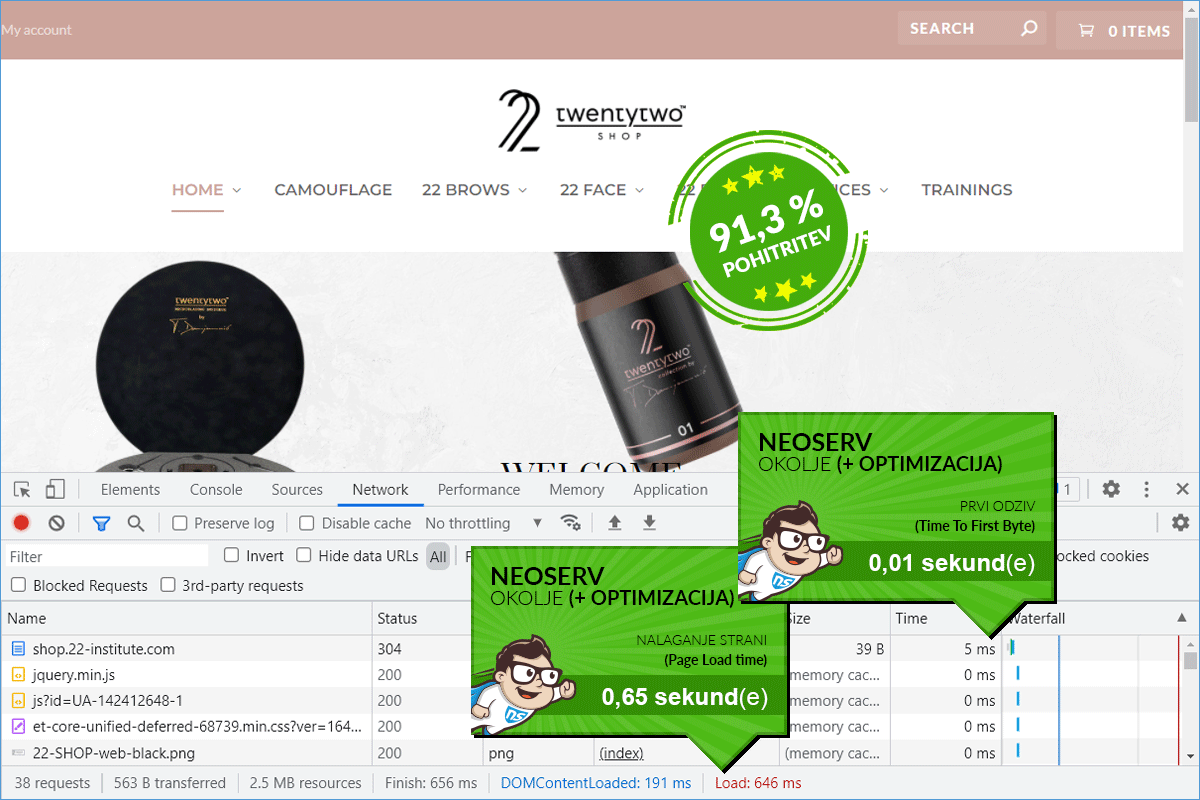 The 22 Institute Shop online store, accessible at shop.22-institute.com, was loading in more than 7 seconds on the old provider's server. The store owners were aware that this was definitely too much to count on successful online sales. They began looking for solutions and soon came across our offer of Turbo packages. They decided to try the package, and of course, we at NEOSERV were happy to meet them halfway and, in addition to the free transfer to our server, we also took care of the basic optimization of the online store's speed.