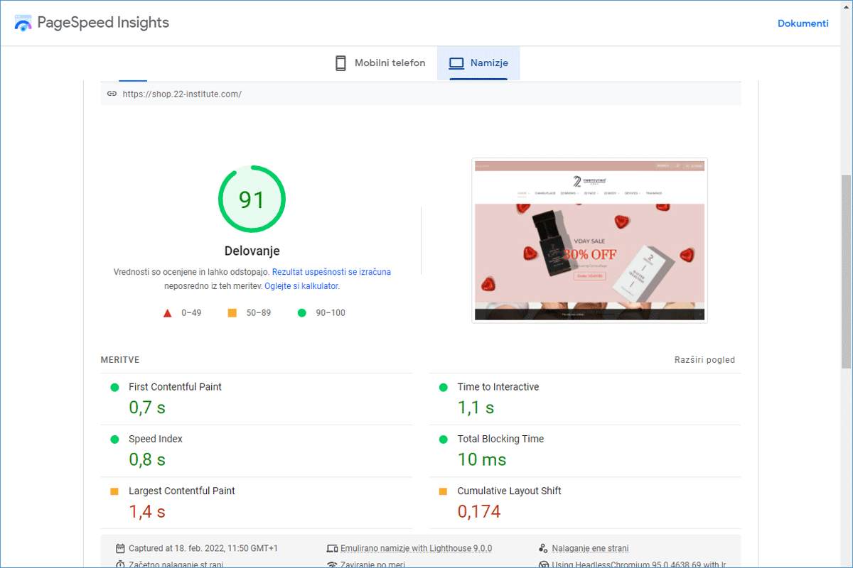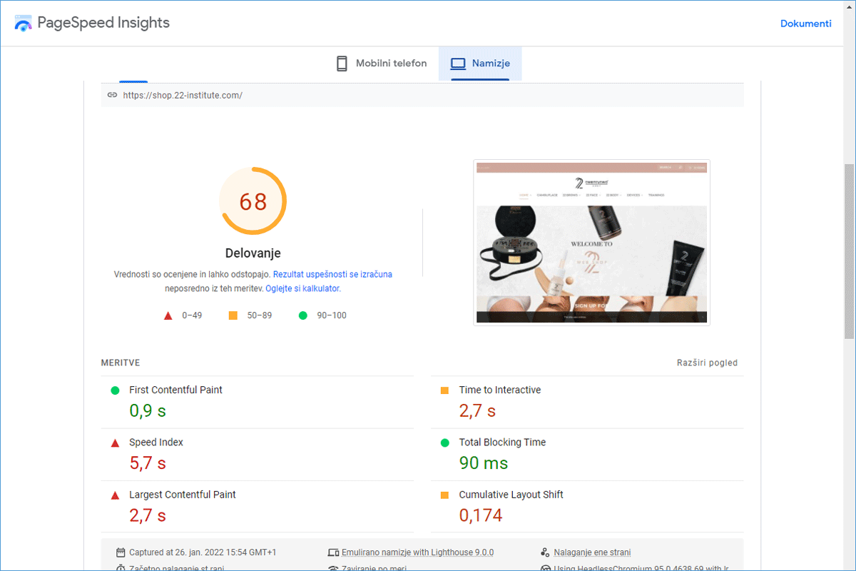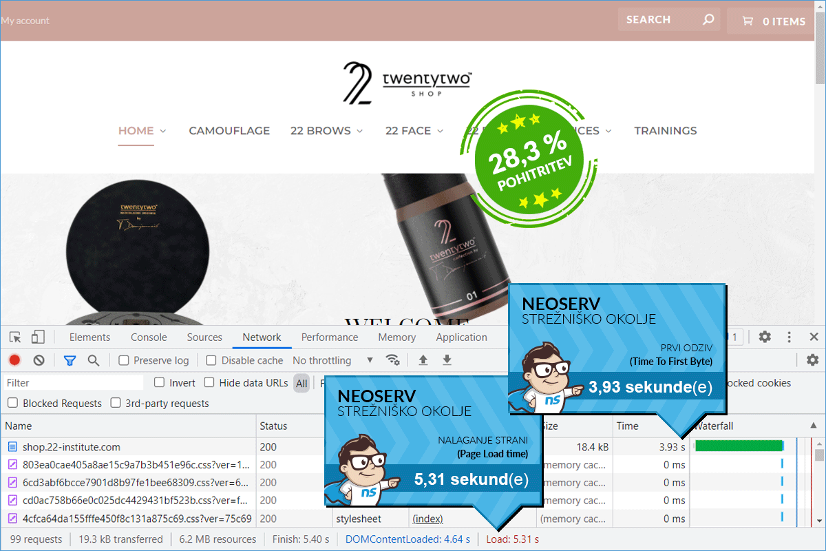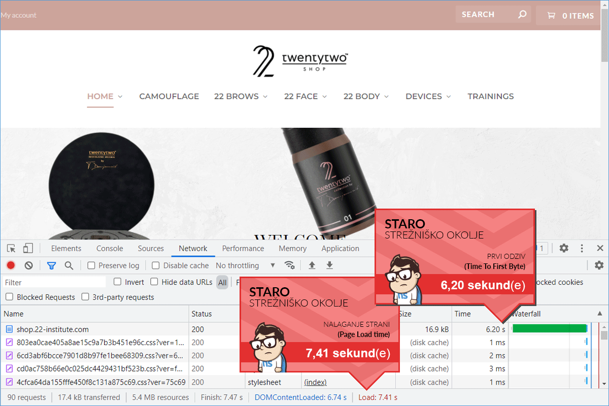 The 22 Institute Shop online store, before being transferred to our environment, was hosted on a server of one of the larger Slovenian web hosting providers. The loading time was almost 7 and a half seconds. Numerous studies have shown that slow-performing websites have a negative impact on user experience, and in the case of an online store, also on sales. The company was aware of this, so they were looking for faster alternative solutions.