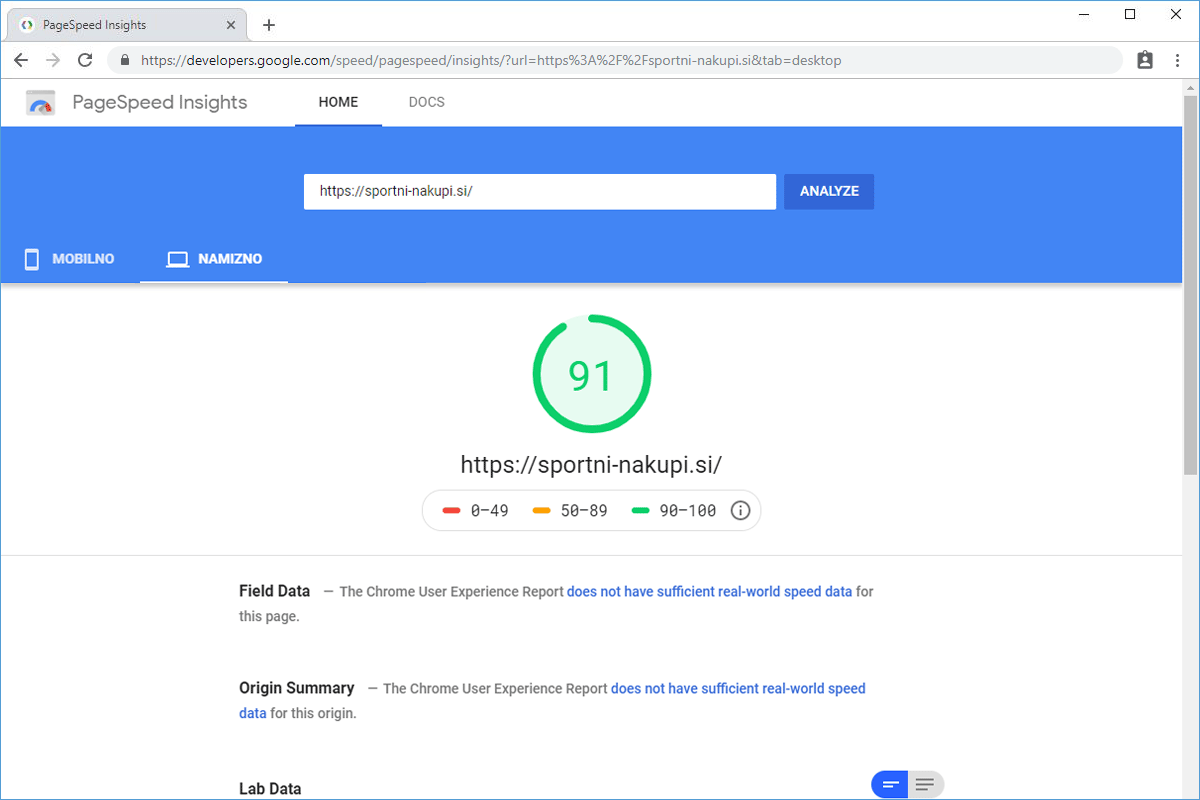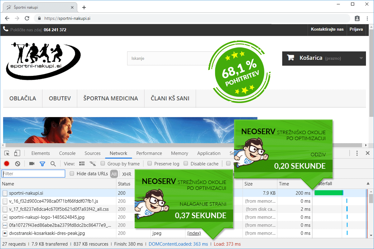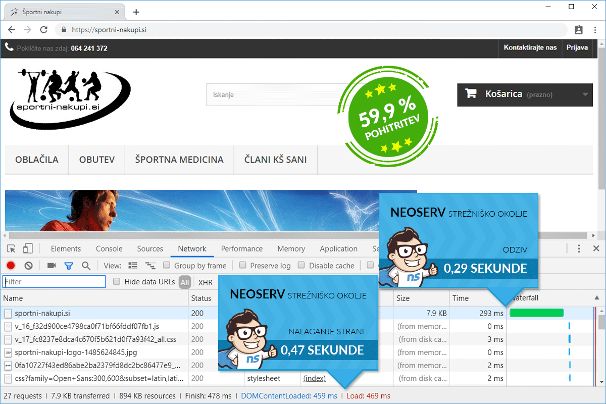 Being aware that the loading speed of a website should not be left to chance, the owners of the online store Sportni-nakupi.si decided to transfer their store to us. Even though their website loaded quite quickly with their old hosting provider, we managed to achieve a significant improvement in loading speed by transferring the store to the NEOSERV server and making a few adjustments.