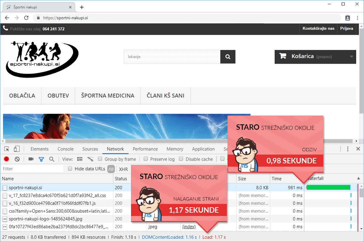 Before we transferred the online store Sportni-nakupi.si from the old provider to the NEOSERV server, we tested the performance speed with the tools Google Chrome DevTools and PageSpeed Insights. The tests showed that the store loads relatively quickly, with the total loading time taking no more than 1.17 seconds. Despite the solid result, we were convinced that the online store would operate even faster on our server.