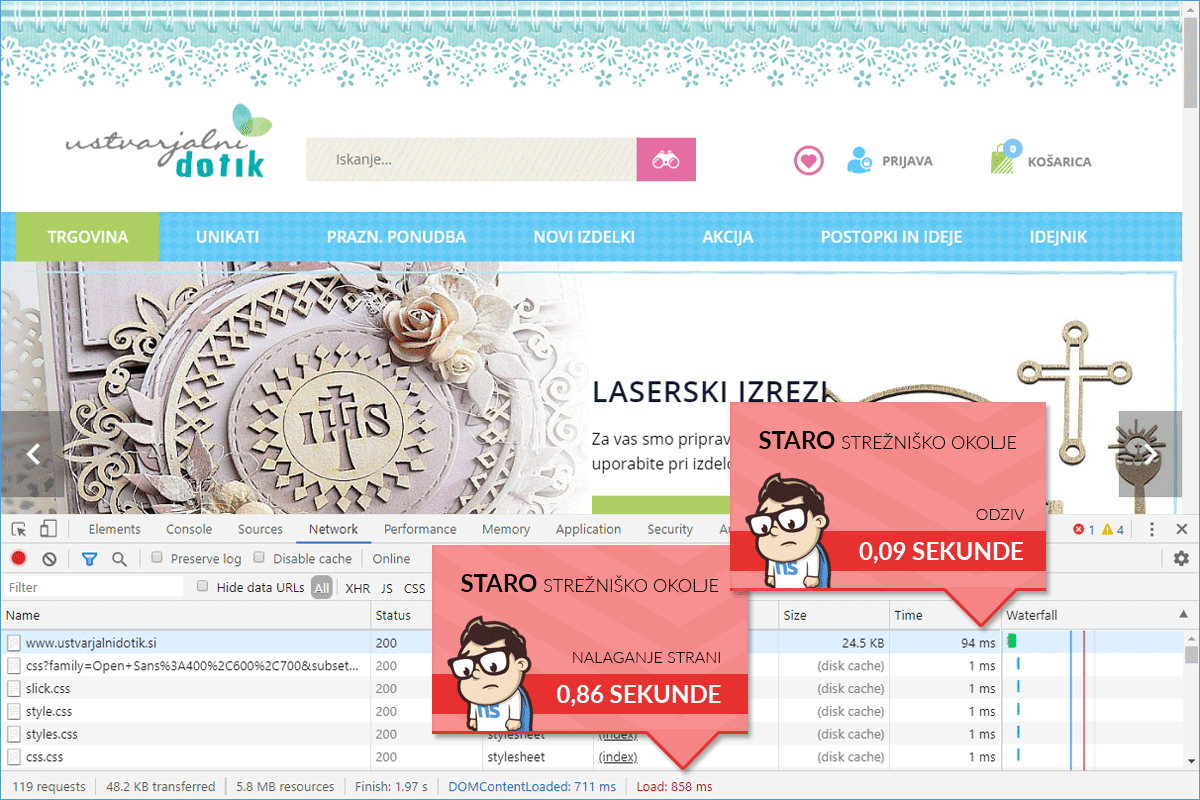 The Ustvarjalni dotik web store, based on the WooCommerce system, was initially hosted with one of the local hosting providers – on a VPS server. The WP Fastest Cache plugin took care of caching, minifying CSS and JS files. The WP-Optimize plugin was also installed to clean up the database. From this, it is evident that quite a lot had already been done for speed optimization, as evidenced by the total loading time of the web store, which was less than 1 second.