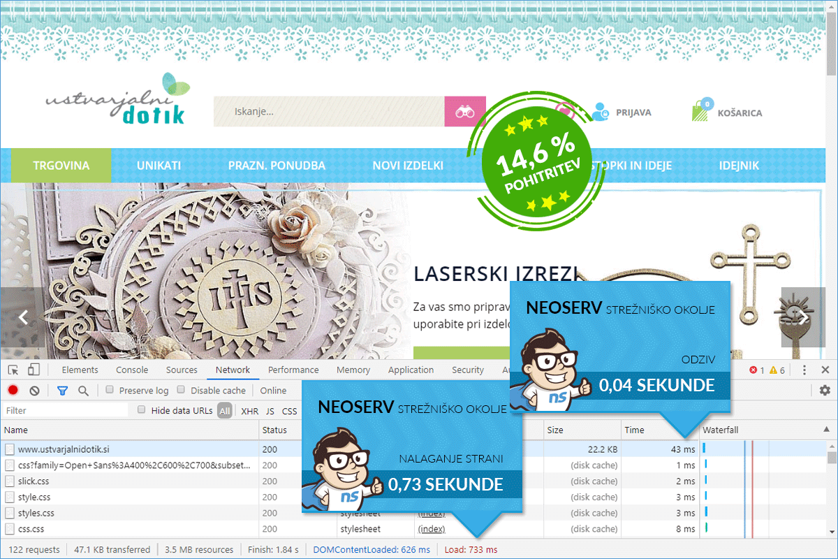 In February 2020, we briefly introduced TURBO hosting to the subscribers of NEOSERV services in our newsletter, aimed at more demanding users. These are packages suitable especially for extensive websites and online stores that attract numerous visitors daily. Several subscribers contacted us to see if they could test for free how fast their website would operate in a TURBO environment. Among them was also the owner of the Ustvarjalnidotik.si web store.