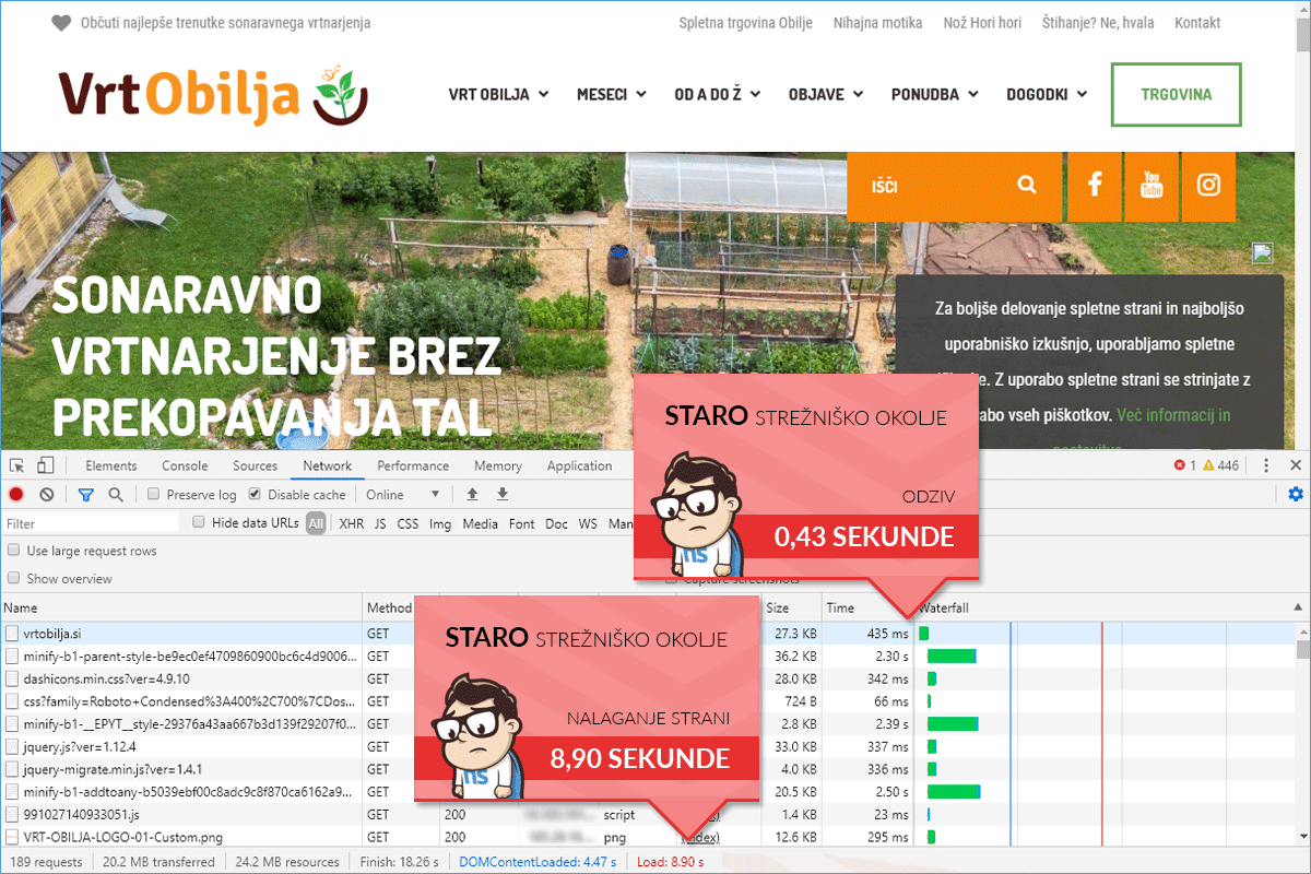 The owners of the web portal Vrtobilja.si, Robi and Tjaša, were looking for a solution to make their site load faster for visitors. The problem was quite serious, as tests showed that the site was loading in almost 9 seconds, which is definitely too long. Such a prolonged total loading time has an extremely negative impact on the user experience, and many people leave the website before it even fully loads.