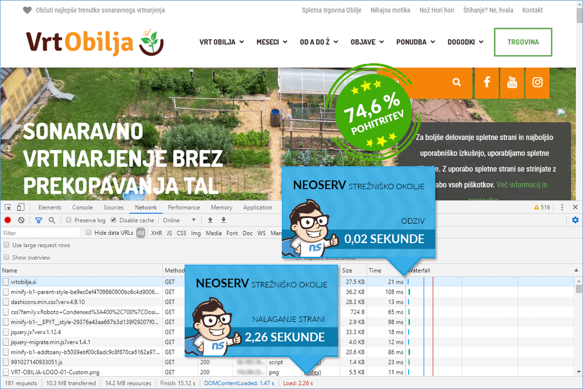 Robi and Tjaša decided to transfer their website to NEOSERV. Of course, we immediately got to work, and a more than noticeable improvement was visible immediately after the transfer. The Vrtobilja.si website loaded on our server in just over two seconds, and with basic speed optimization, which included only a few minor adjustments, we accelerated the site by 86.07% compared to the original state.